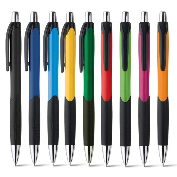Esferográfica. ABS. Com grip. Acabamento brilhante. Ponteira cromada. 1,5km de escrita. ø10 x 138 mm