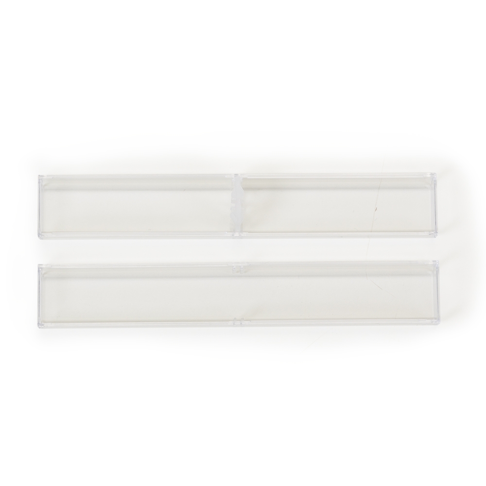 Descrição: Tubo de acrílico retangular, há uma espécie de “anel” central emborrachado para sustentar/encaixar a caneta. OBS.: PEDIDO APENAS MÚLTIPLO DE 50 PEÇAS!
