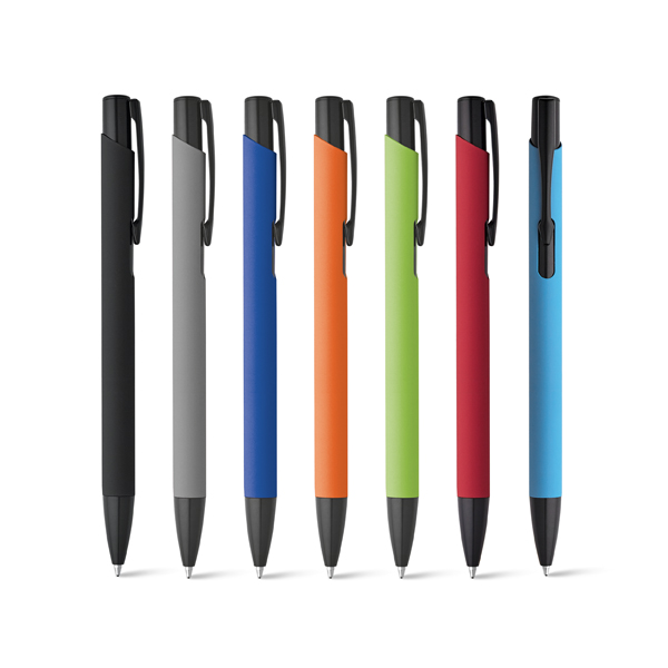 Esferográfica em alumínio com corpo colorido, acabamento emborrachado e clipe de metal. Até 1,5 km de escrita. Escrita em preto. ø10 x 137 mm