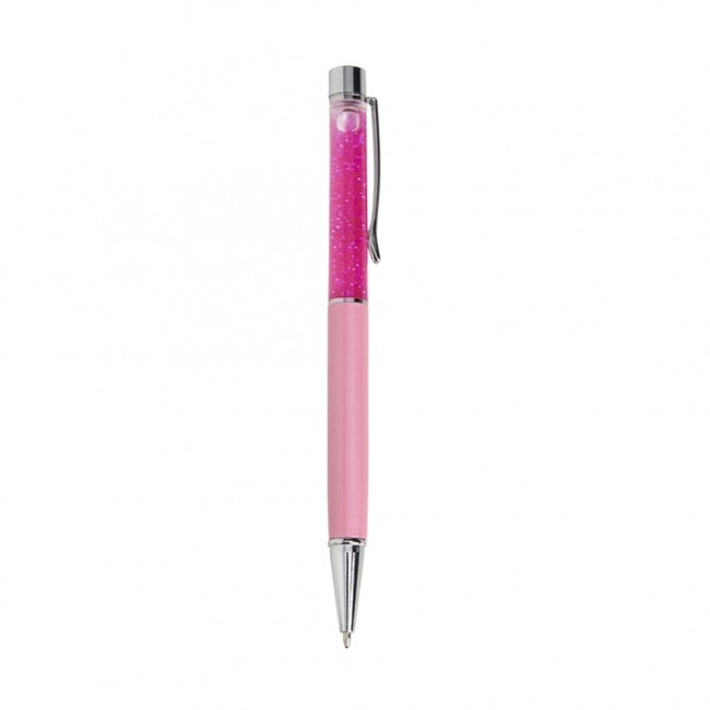 Descrição: Caneta metálica com glitter, acionamento por rotação e carga esferográfica 1.0mm azul.