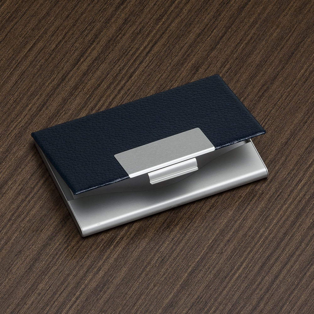 Descrição: Porta cartão em couro sintético com detalhes em prata. Possui chapa central em metal para gravação, parte interna e traseira em alumínio.