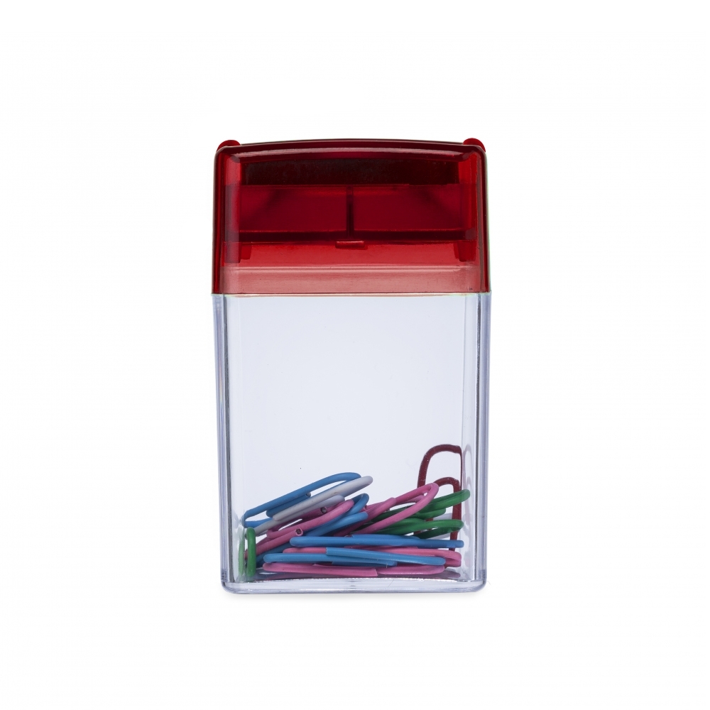 Descrição: Porta clipes com tampa magnética colorida, acompanham clipes coloridos.