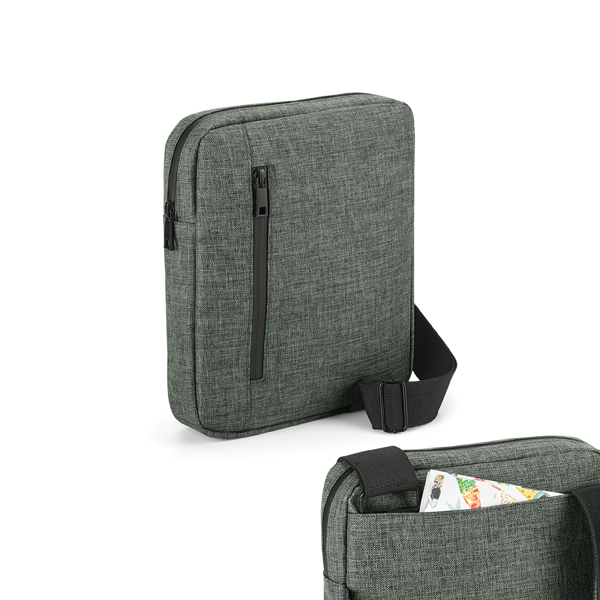 Pasta à tiracolo. 600D de alta densidade. Compartimento forrado com divisória almofadada para tablet 9.7” e diversos bolsos interiores. Parte posterior almofadada. Com bolso frontal e bolso posterior. Alça de ombro ajustável. 220 x 270 x 45 mm